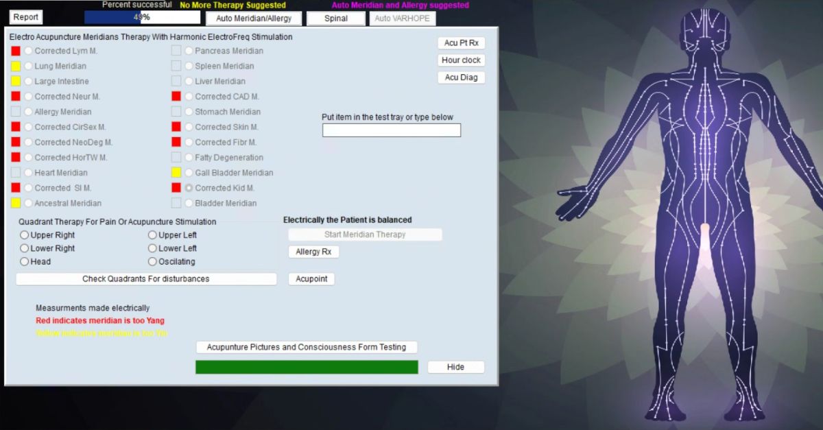 Важная замечание: система использует подход «сверхсознания». Терапевту не нужно уметь физически вводить иглы; система использует резонанс для обнаружения «потребности» организма и обеспечивает вибрационную частоту, эквивалентную стимуляции этой точки или меридиана.
